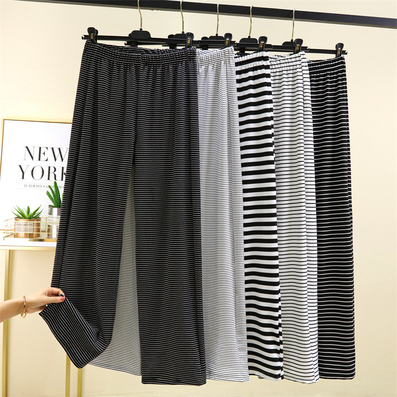 Celana Panjang Dipakai Luar Pinggang Tinggi Musim Gugur Musim Dingin Wanita, Celana Tidur Ukuran Besar Celana Kaki Lebar Ekstra Beludru, Celana Kasual Garis Hitam Putih, Beludru