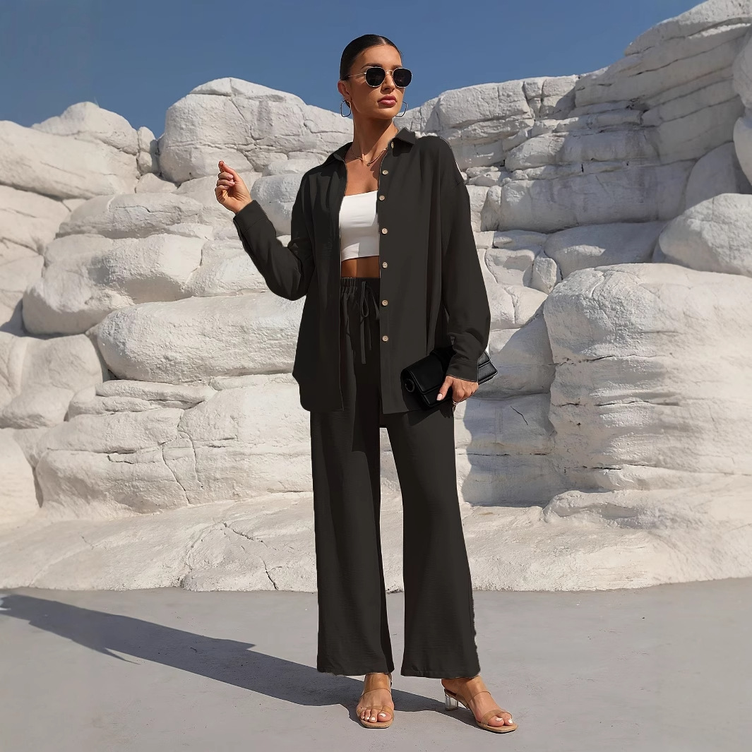 AliExpress Setelan Kemeja Lengan Panjang Wanita Pinggang Tinggi Retro Ukuran Besar Modis Dua Potong Celana Sembilan Perempat Longgar Lintas Batas Musim Semi