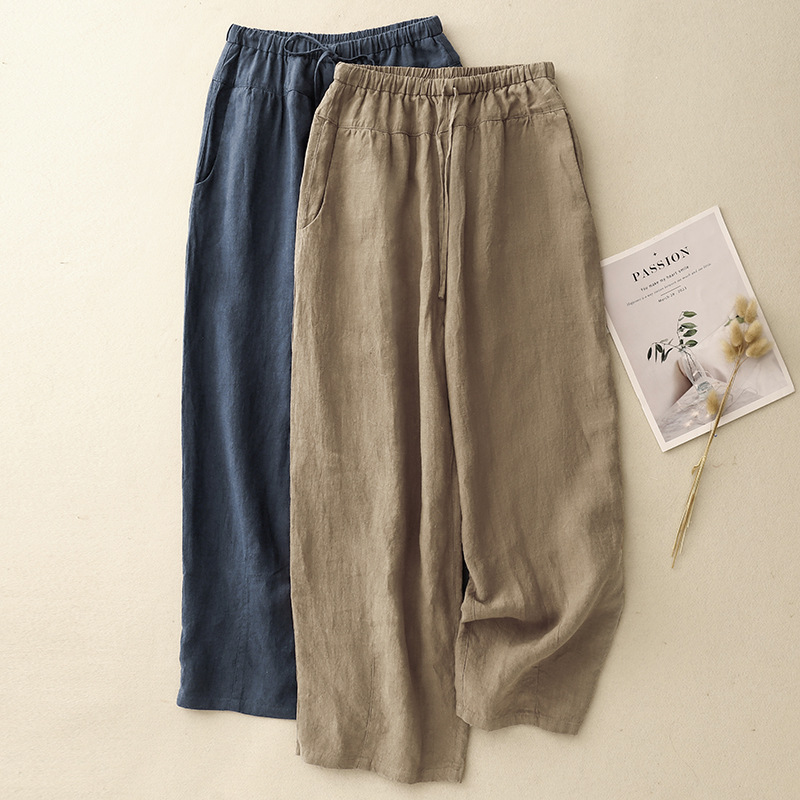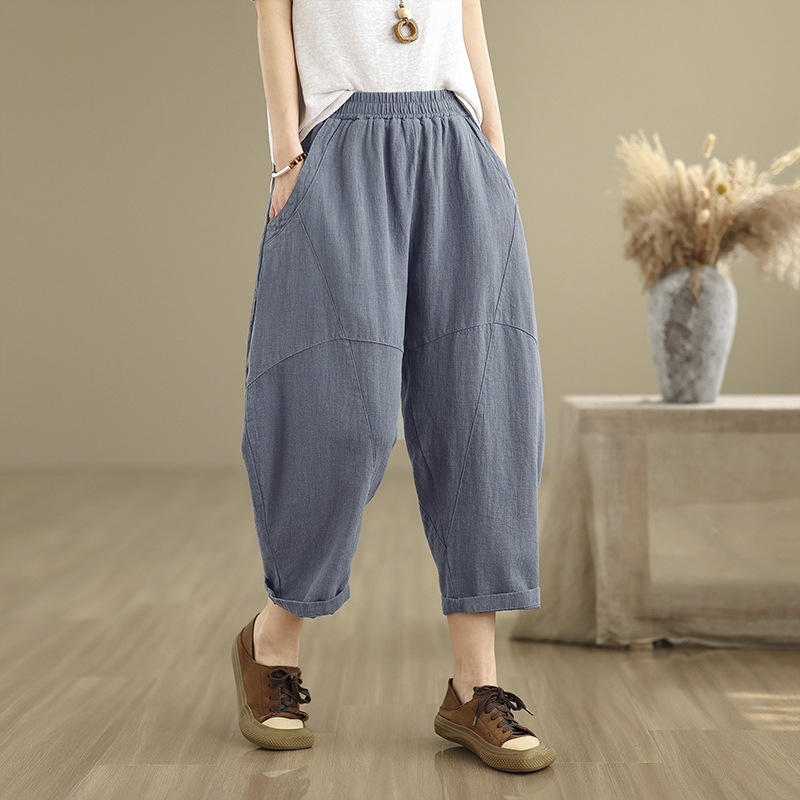 Celana Kasual Linen Gaya Zen Terlihat Langsing Longgar Celana Pinggang Elastis Ukuran Besar Retro Seni Model Baru Celana Wanita Harlan Sembilan Poin