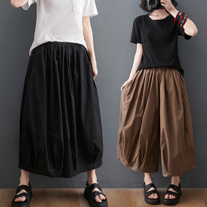 Celana Setengah Kaki Lebar Kasual Ukuran Besar Longgar Terlihat Ramping Pinggang Tinggi Modis Model Baru Musim Panas Wanita Celana Kerja Cuci Katun Murni