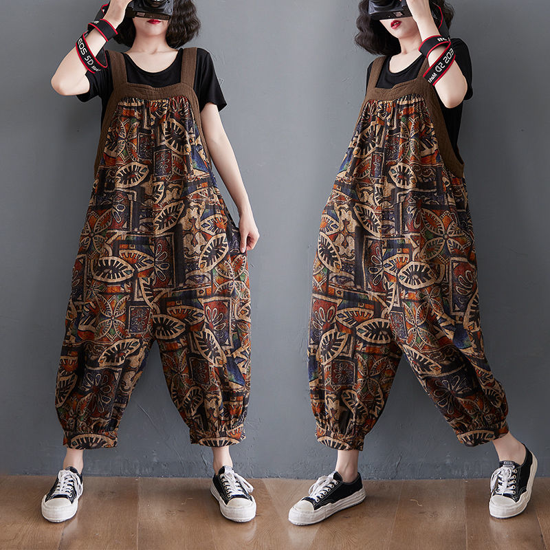 Celana suspender wanita, gaya Perancis, celana suspender musim panas longgar cetak satu potong pinggang tebal dipotong kasual ukuran besar