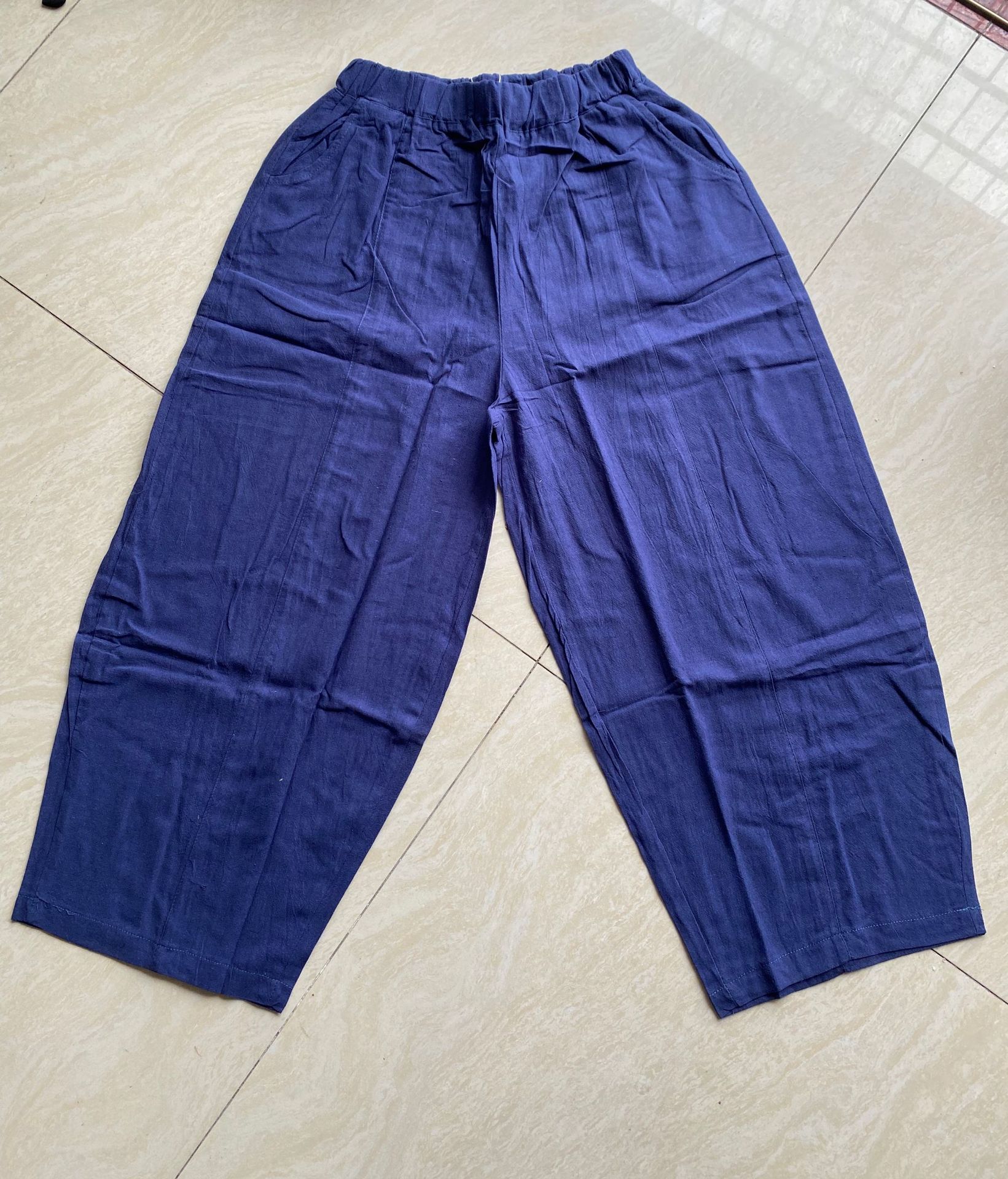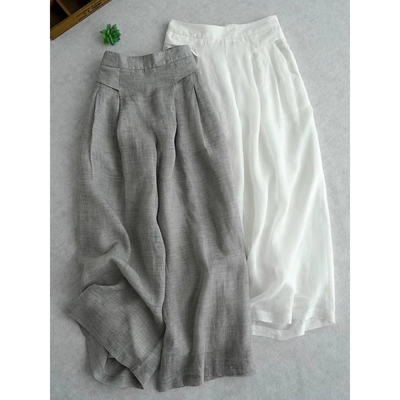 Gambar Resmi Barang Tersedia 2025 Musim Panas Model Baru Ukuran Besar Celana Kaki Lebar Katun Linen Gaya Terjatuh Celana Wanita Bernapas Ringan Tipis Pinggang Tinggi