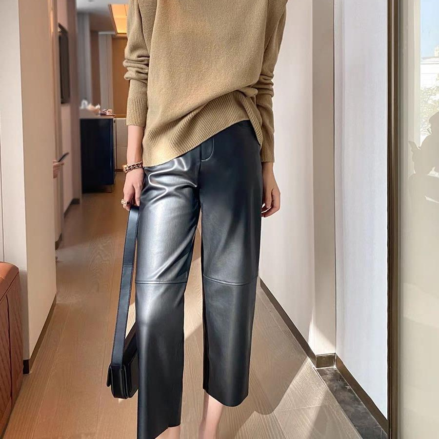 Celana kulit PU hitam wanita, bawahan potongan ramping pinggang tinggi lurus ukuran besar musim gugur dan musim dingin 2023