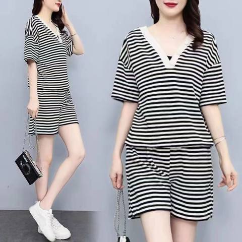 Setelan olahraga kasual longgar wanita, Kaus bergaris gaya Barat baru musim panas dua potong ukuran besar perempuan
