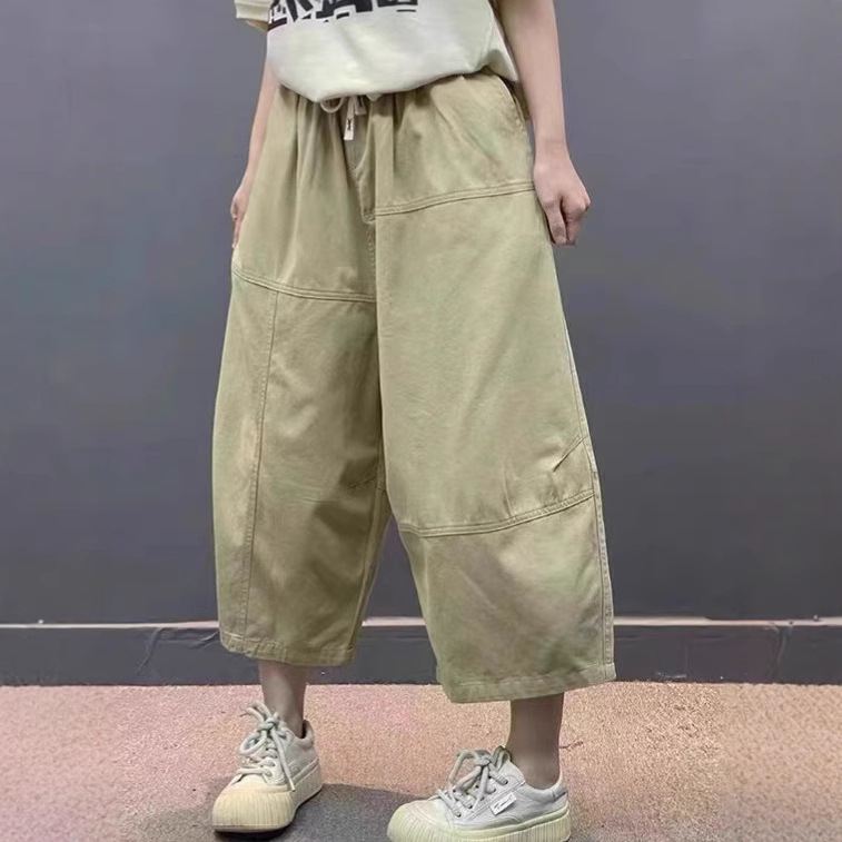 Celana Kasual Wanita Model Baru Musim Panas 2025 Celana Tujuh Perempat Celana Lurus Celana Kerja Pinggang Elastis Tali Serut Model Besar