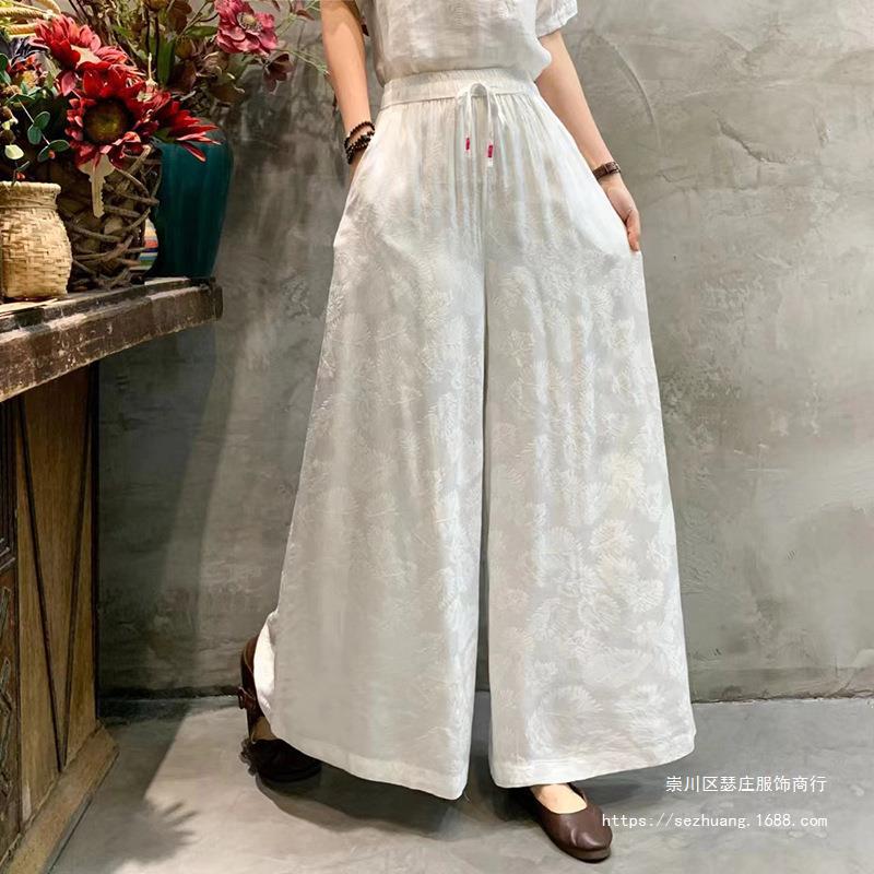 Celana panjang satin jacquard gaya etnik untuk wanita, musim panas 2025, ukuran besar, model pelangsing, potongan lurus, pinggang tinggi, warna solid.