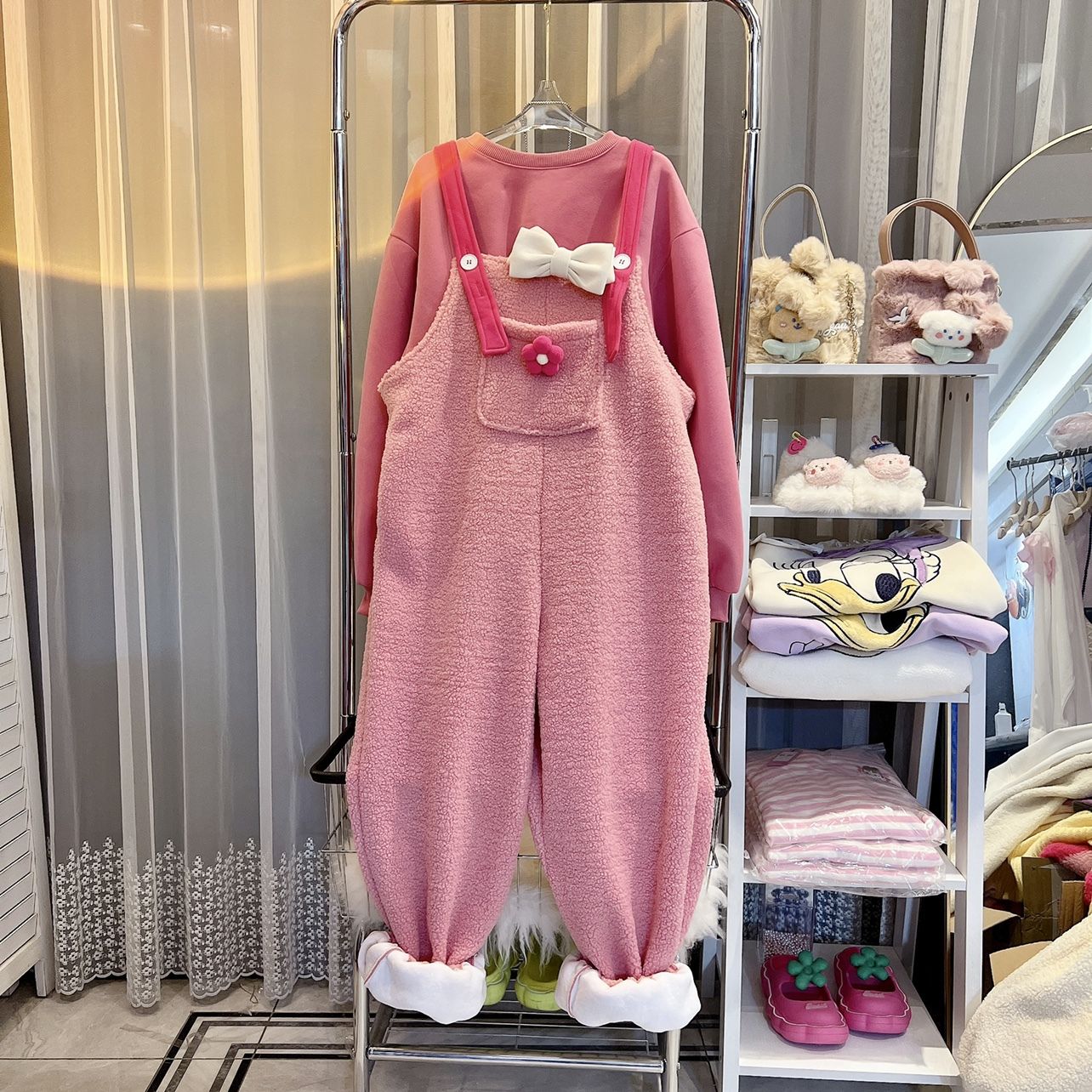 Celana suspender wanita, celana panjang ekstra besar ukuran 1.00 kg-150.00 kg gemuk musim gugur dan musim dingin manis pengurang bulu hangat berbulu tiga dimensi modis wanita