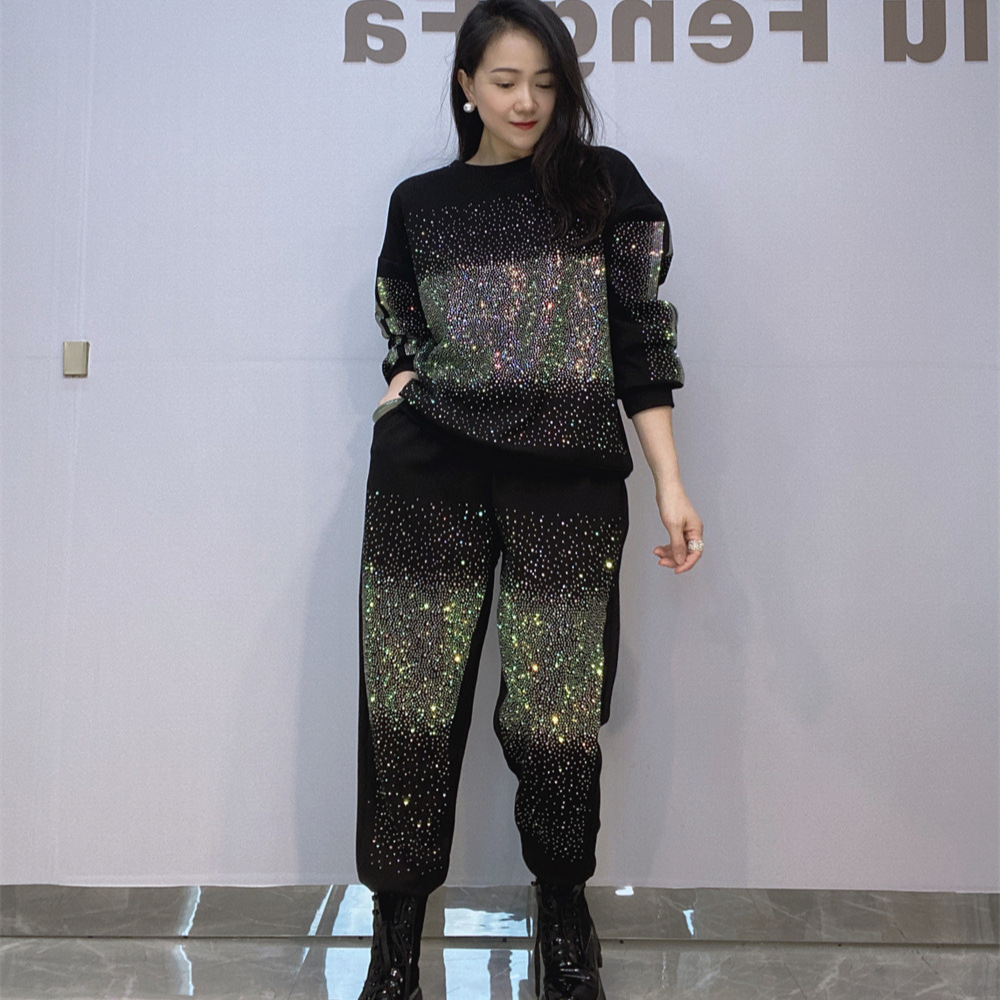 Setelan Sweater Lengan Panjang Pullover Kerah Bulat Model Baru Musim Gugur Wanita Set Dua Potong Berlian Bintang Penuh Ukuran Besar Wanita