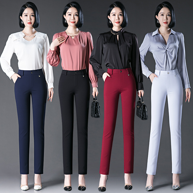 Celana panjang lurus putih elastis berpinggang tinggi model terbaru untuk ibu paruh baya, celana kasual ukuran besar untuk wanita bertubuh mungil.