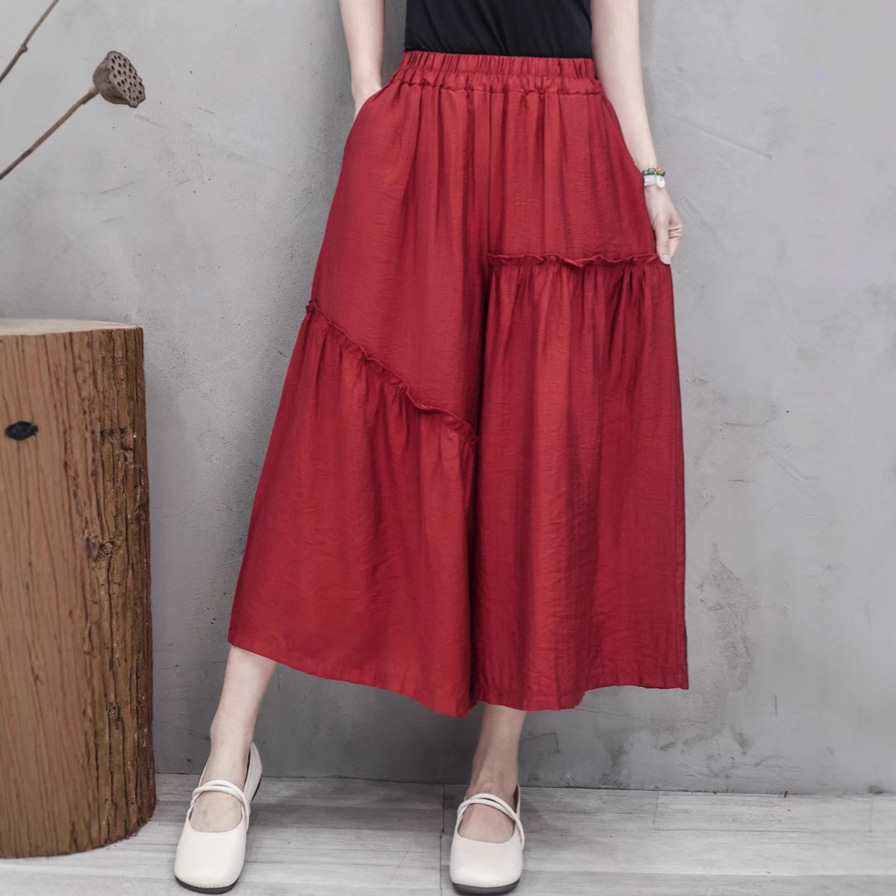 Foto Solid Model Baru 2025 Celana Kaki Lebar Pinggang Elastis Sederhana Longgar Musim Panas Celana Sembilan Persepuluh Warna Polos Celana Wanita Ukuran Besar