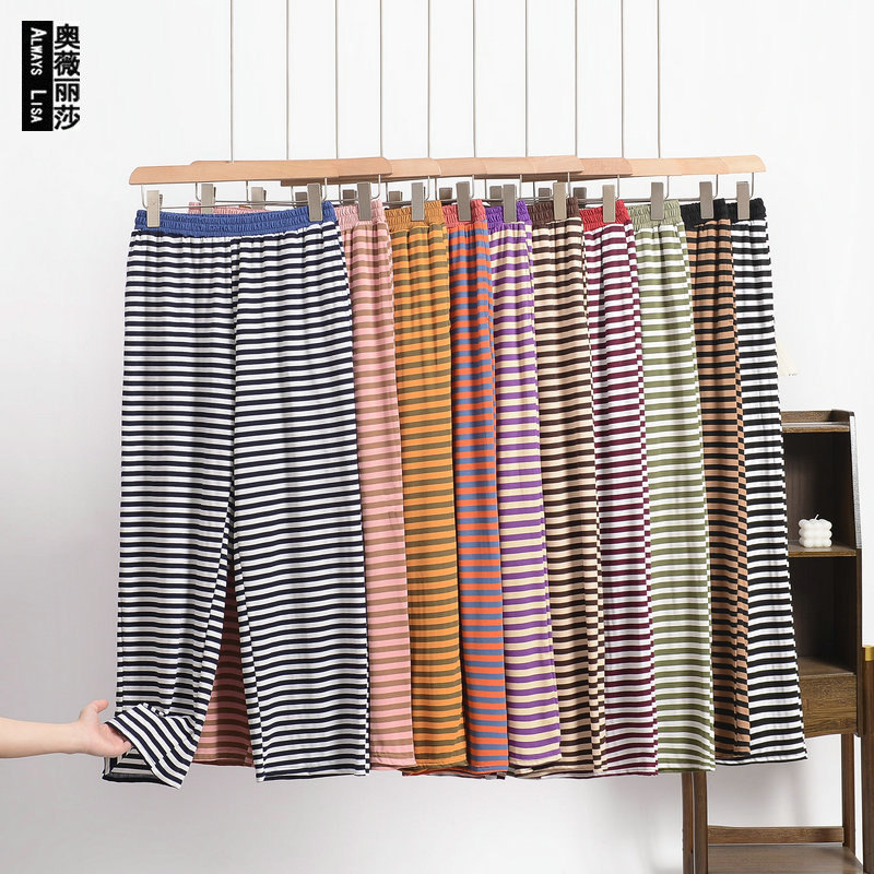 Celana Lurus Garis-Garis Modal Musim Panas Wanita Celana Kaki Lebar Tambah Besar Celana Kasual Ibu Paruh Baya Celana Piyama Longgar Celana Panjang