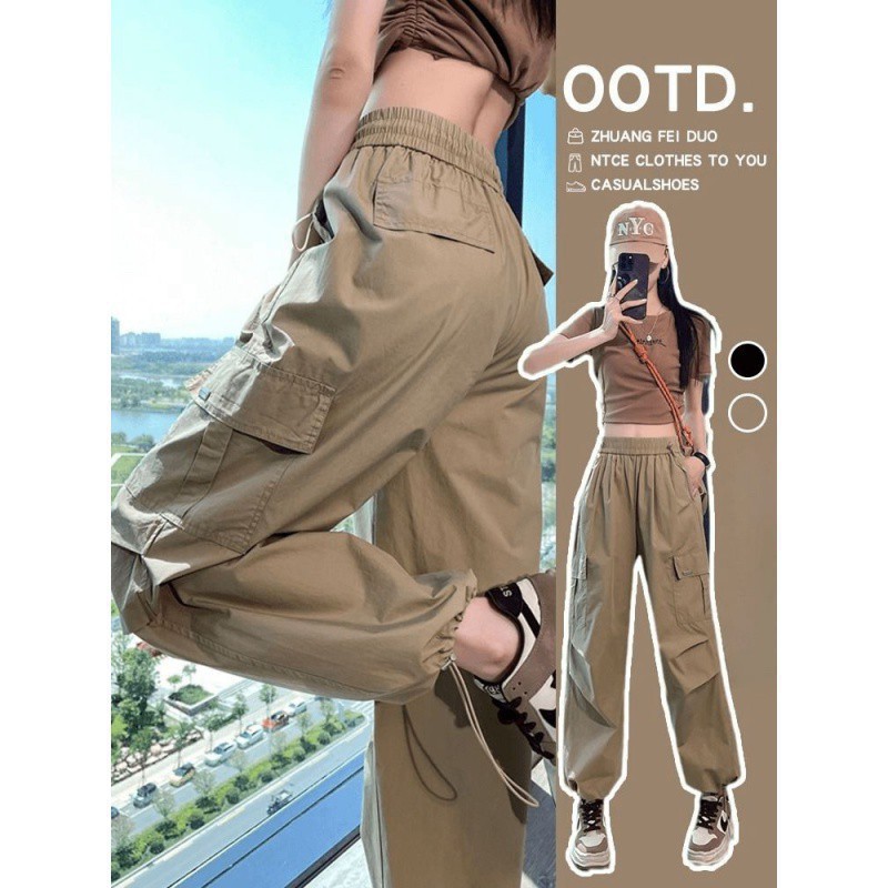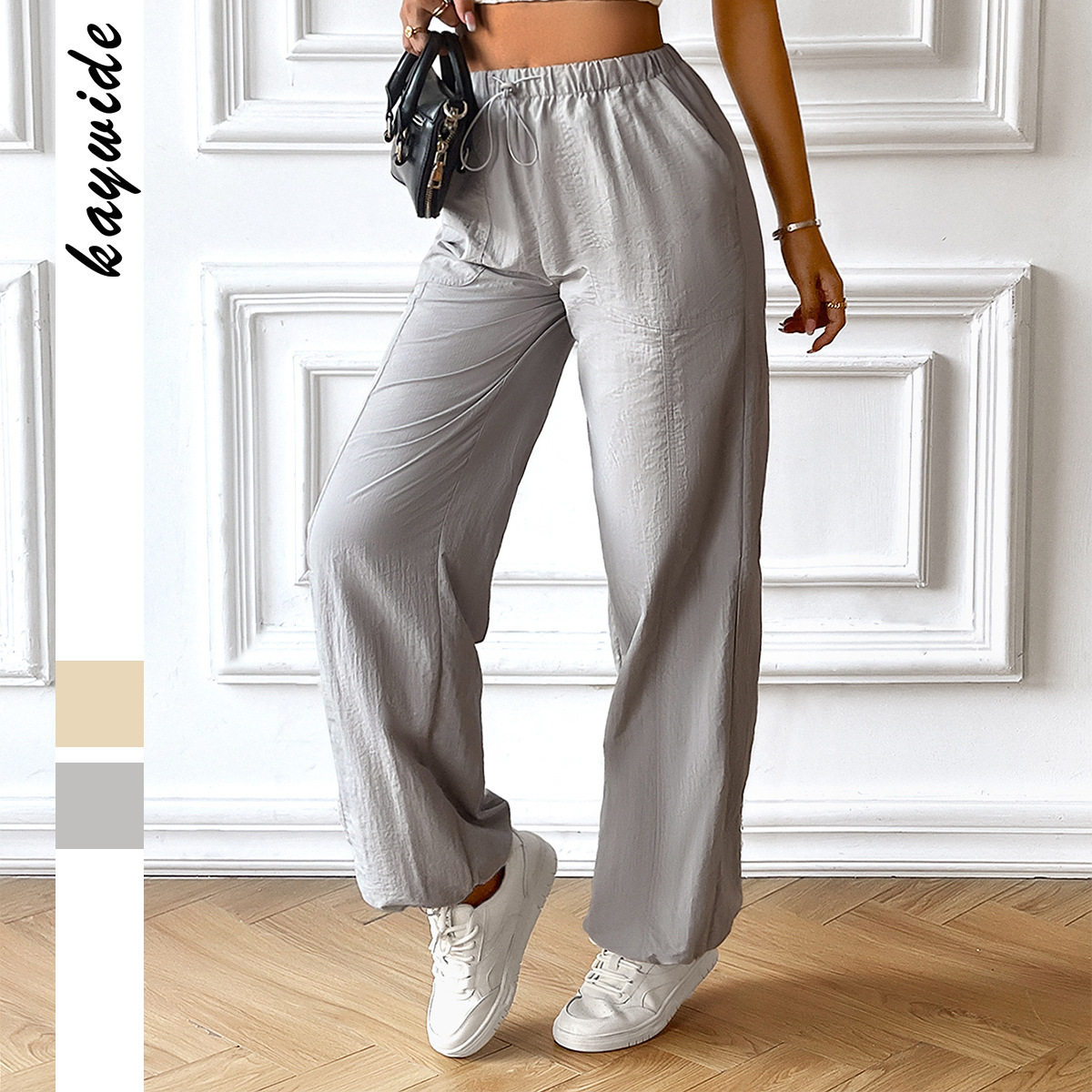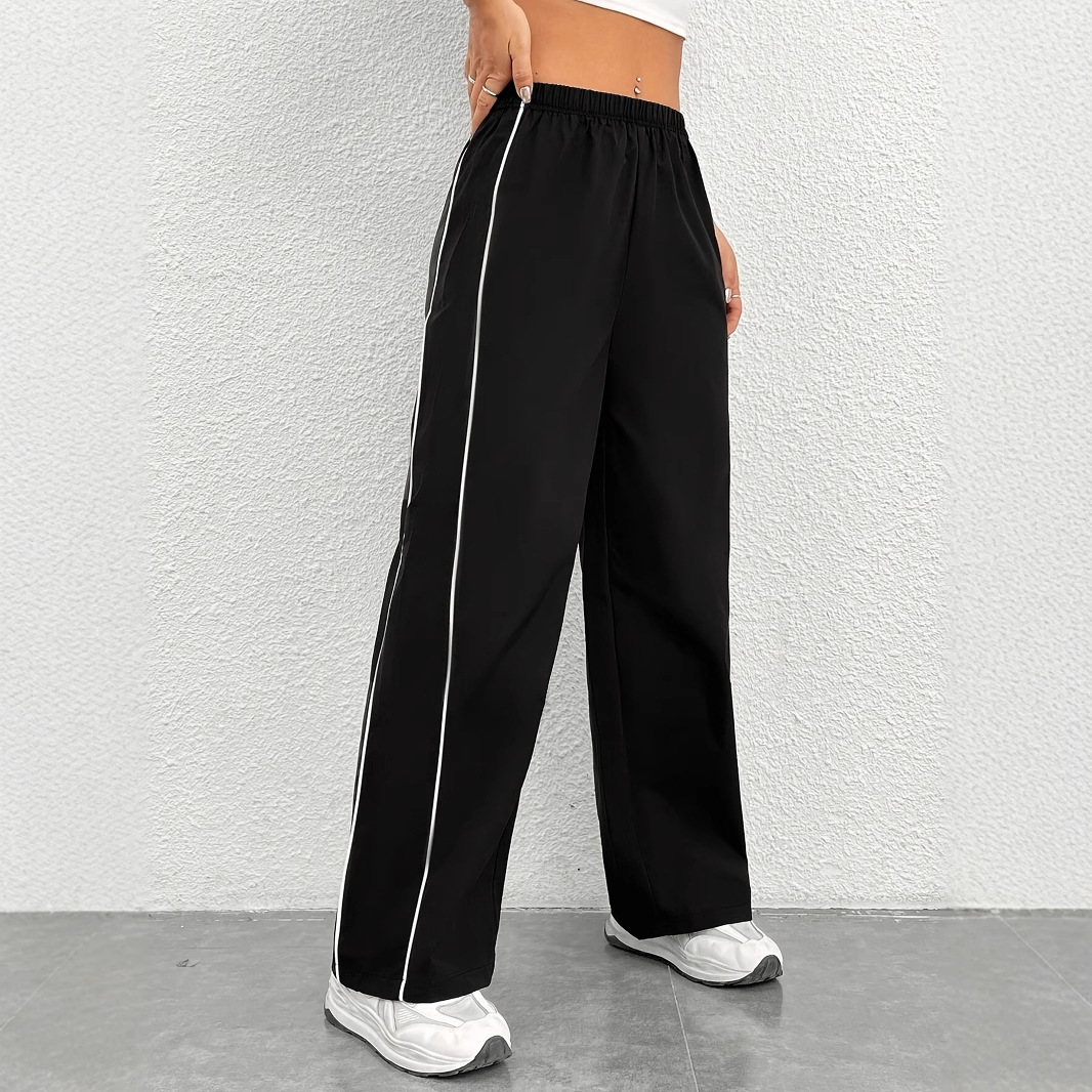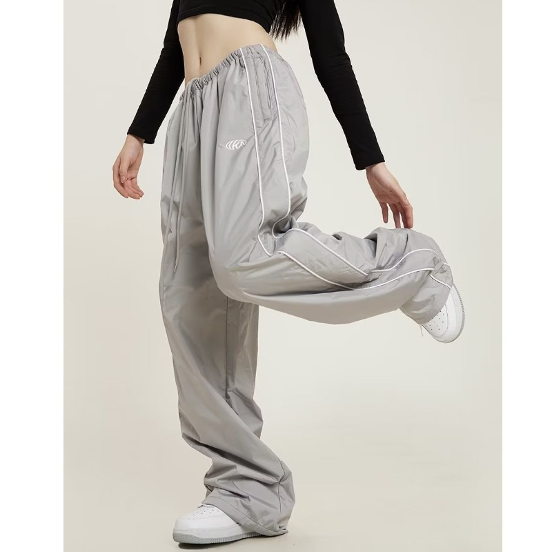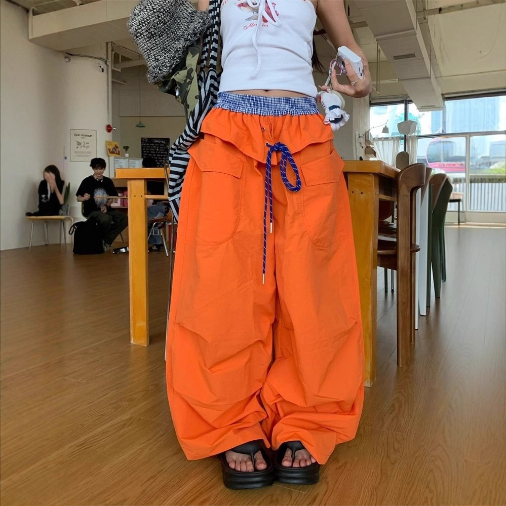 Celana Kerja Cepat Kering Kombinasi Warna Kontras Gadis Pedas Gaya Amerika Celana Olahraga Kaki Lebar Payung Luar Ruangan Pinggang Tinggi Tali Tipis Model Musim Panas Wanita