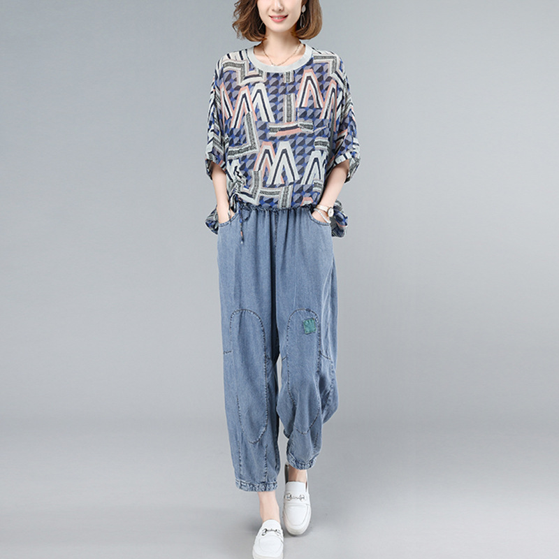 Setelan Fashion Kasual Wanita Musim Panas Model Baru Ukuran Besar Celana Jeans Longgar Gaya Barat Pakaian Musim Panas Ibu Lengan Pendek Setelan Dua Potong