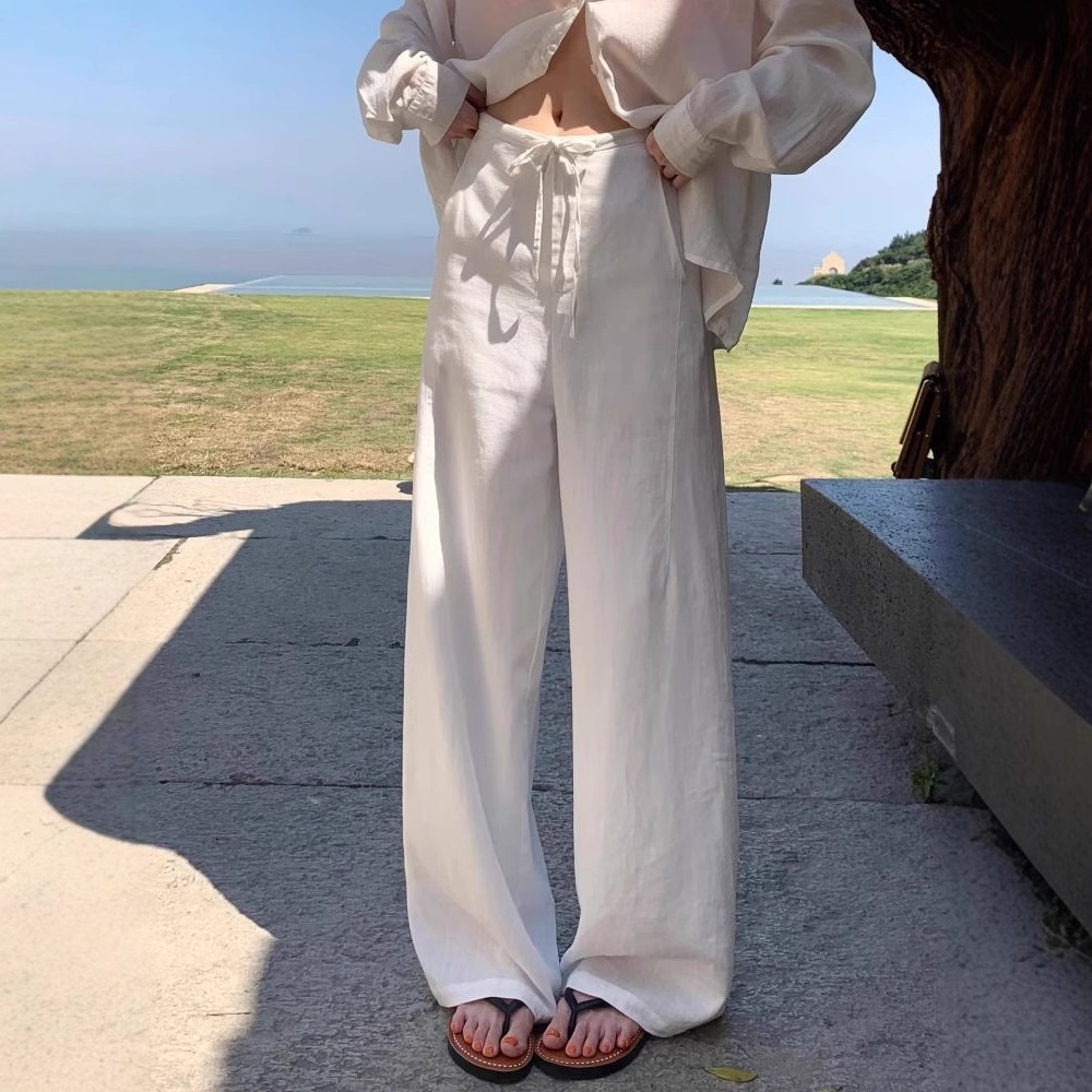 Celana Linen Warna Putih Celana Lurus Katun Linen Model Jepang Model Tipis Musim Panas Wanita Celana Kaki Lebar Pelindung Terik Matahari Kasual Celana Panjang Kecil