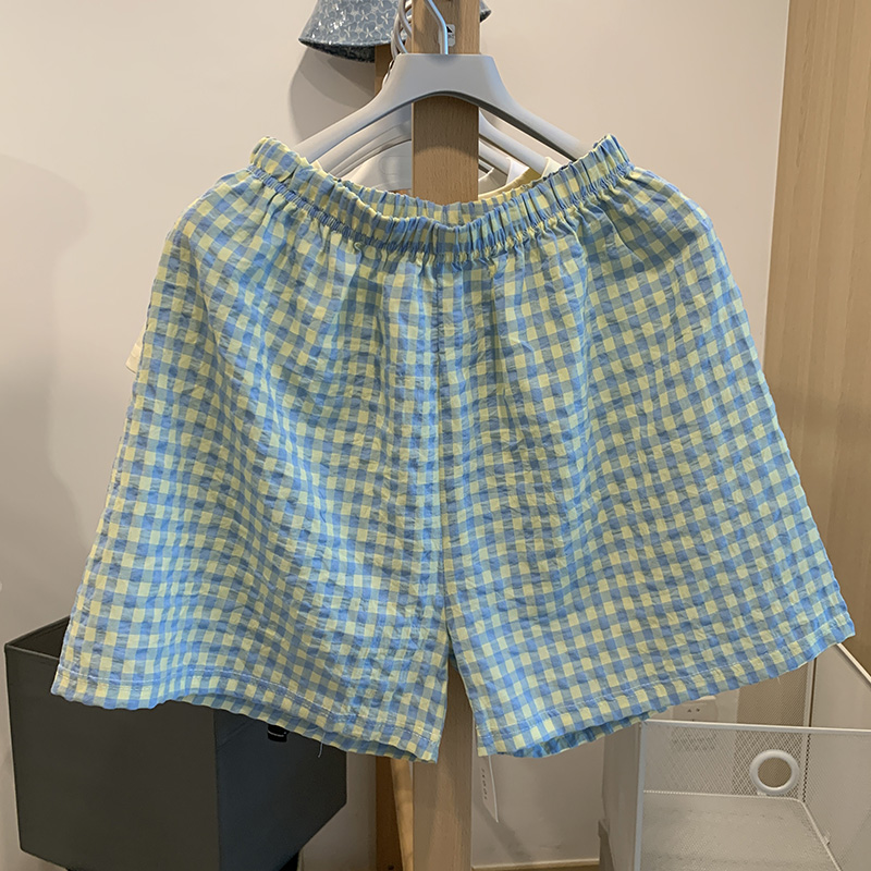 Celana Piyama Kotak-kotak Celana Malas Rumah Model Tipis Musim Panas Wanita Celana Kaki Lebar Kasual Lurus Celana Pendek Luar Rumah Celana Dewa Melengkung