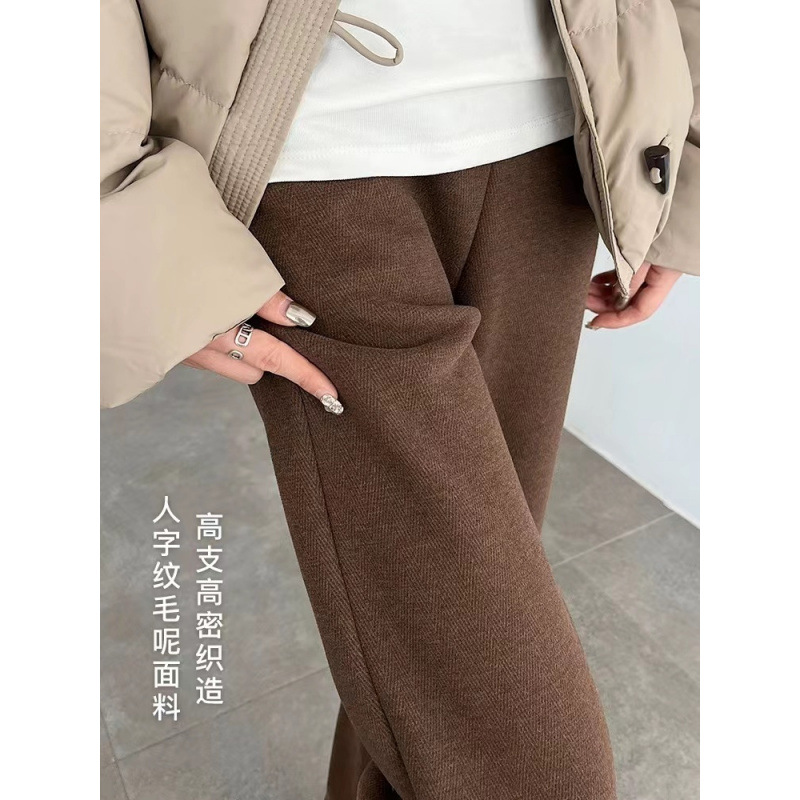 Maillard Celana Warna Coklat Wanita Musim Gugur Musim Dingin Pinggang Tinggi Lurus Wol Kecil Versi Sempit Ditambah Beludru Celana Kaki Lebar Pola Karakter