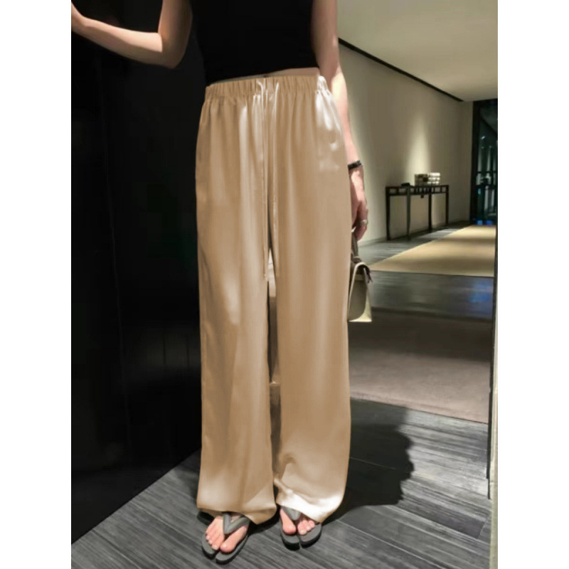 Celana Kaki Lebar Satin Asam Asetat Imitasi Sederhana Versi Korea Celana Panjang Wanita Musim Panas Model Tipis Pinggang Tinggi Kasual Gaya Gantung