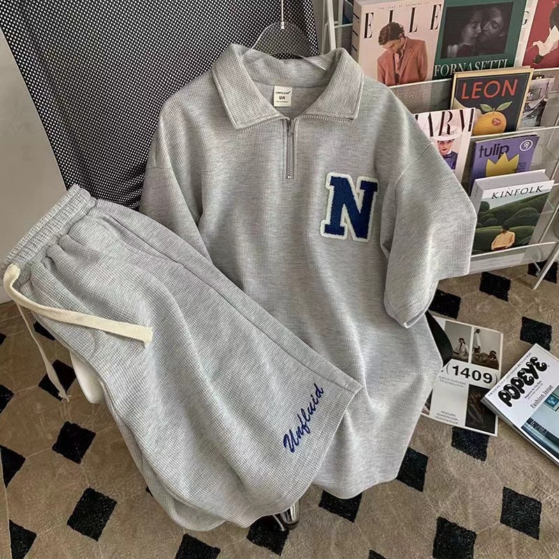 Setelan Kasual Gaya Amerika Asia Tenggara Celana Pendek Lengan Pendek Huruf Longgar Model Baru Musim Panas Setelan Dua Potong Olahraga Pelajar Mengurangi Usia