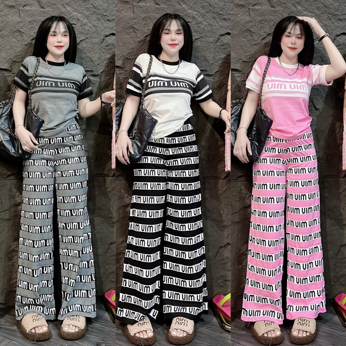 Pakaian Modis Wanita Perdagangan Luar Negeri Lintas Batas Musim Panas Model Baru Warna Kontras Lengan Pendek Bercorak Celana Panjang Kaki Lebar Kasual Set Dua Potong