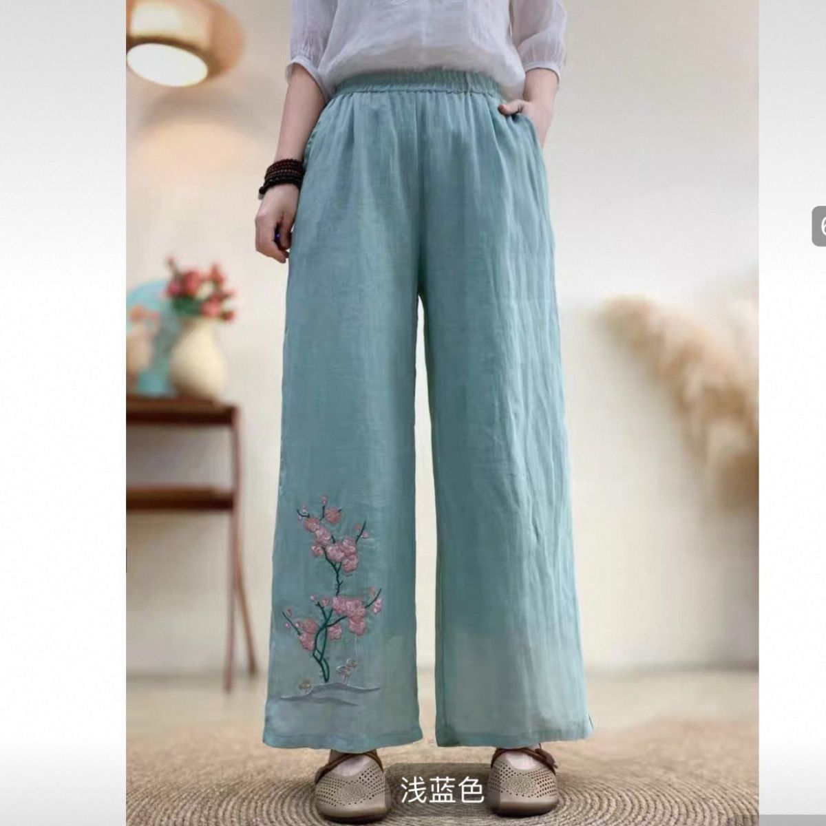 Celana Katun Linen Gaya Tiongkok Ukuran Besar 200Kg Celana Kasual Bordir Gaya Etnik Musim Panas Celana Longgar Kaki Lebar Retro Wanita