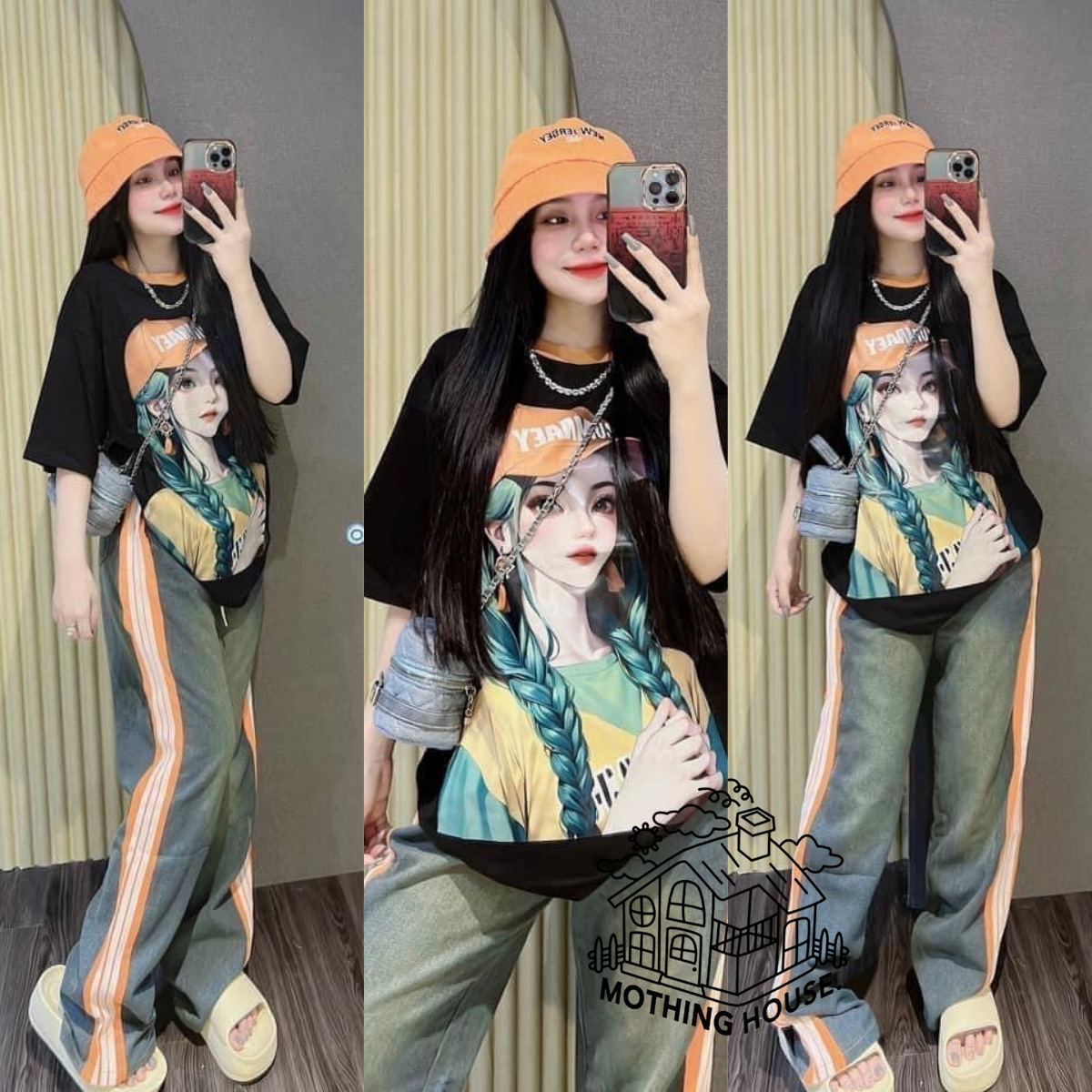 Pakaian Setelan Wanita Modis Gaya Amerika Perdagangan Luar Negeri Celana Panjang Kaki Lebar Lengan Pendek Motif Cetak Karakter Longgar Model Baru Musim Panas Kasual Setelan Dua Potong
