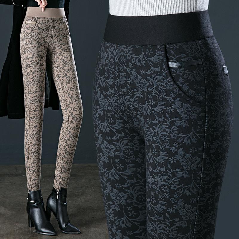 Flowery celana legging satu potong wol tebal, celana legging wanita pinggang tinggi timur laut ukuran plus ekstra tebal
