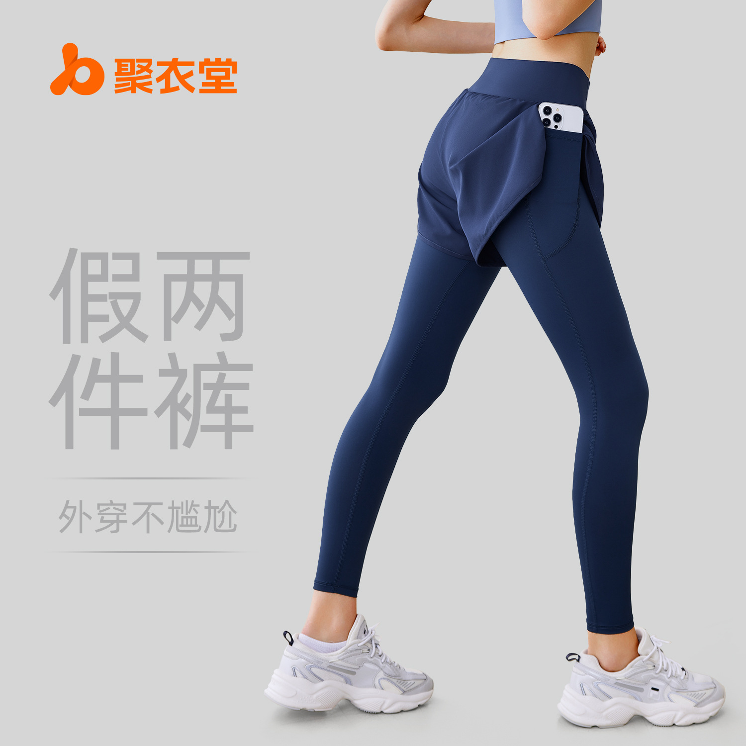 Celana Yoga Kantong Dua Potong Palsu Jubah Celana Ketat Olahraga Kebugaran Lari Pinggang Tinggi Elastis Wanita