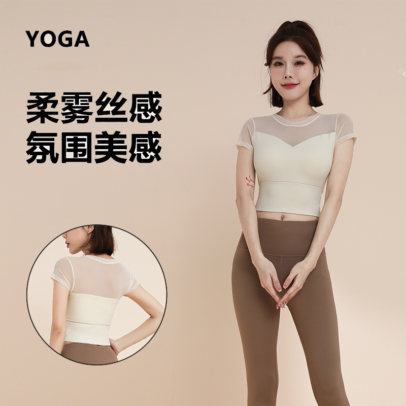 瑜伽服女网纱假两件短袖夏带胸垫紧身显瘦气质运动跑步健身服套装