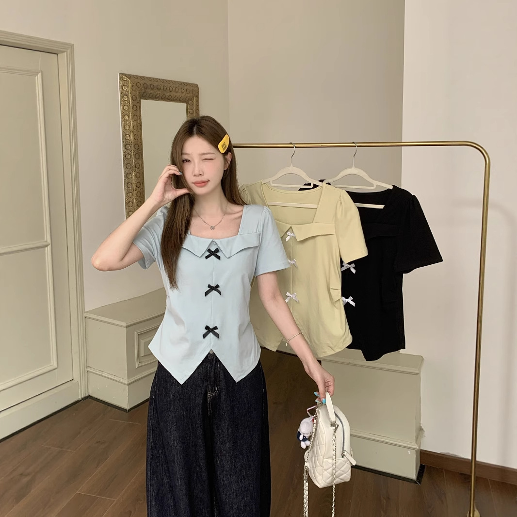 T-shirt Lengan Pendek Pita Kupu-Kupu Tiga Dimensi Gaya Perancis Ukuran Besar Foto Solid Atasan Unik Desain Terlihat Langsing Musim Panas 2025 64720