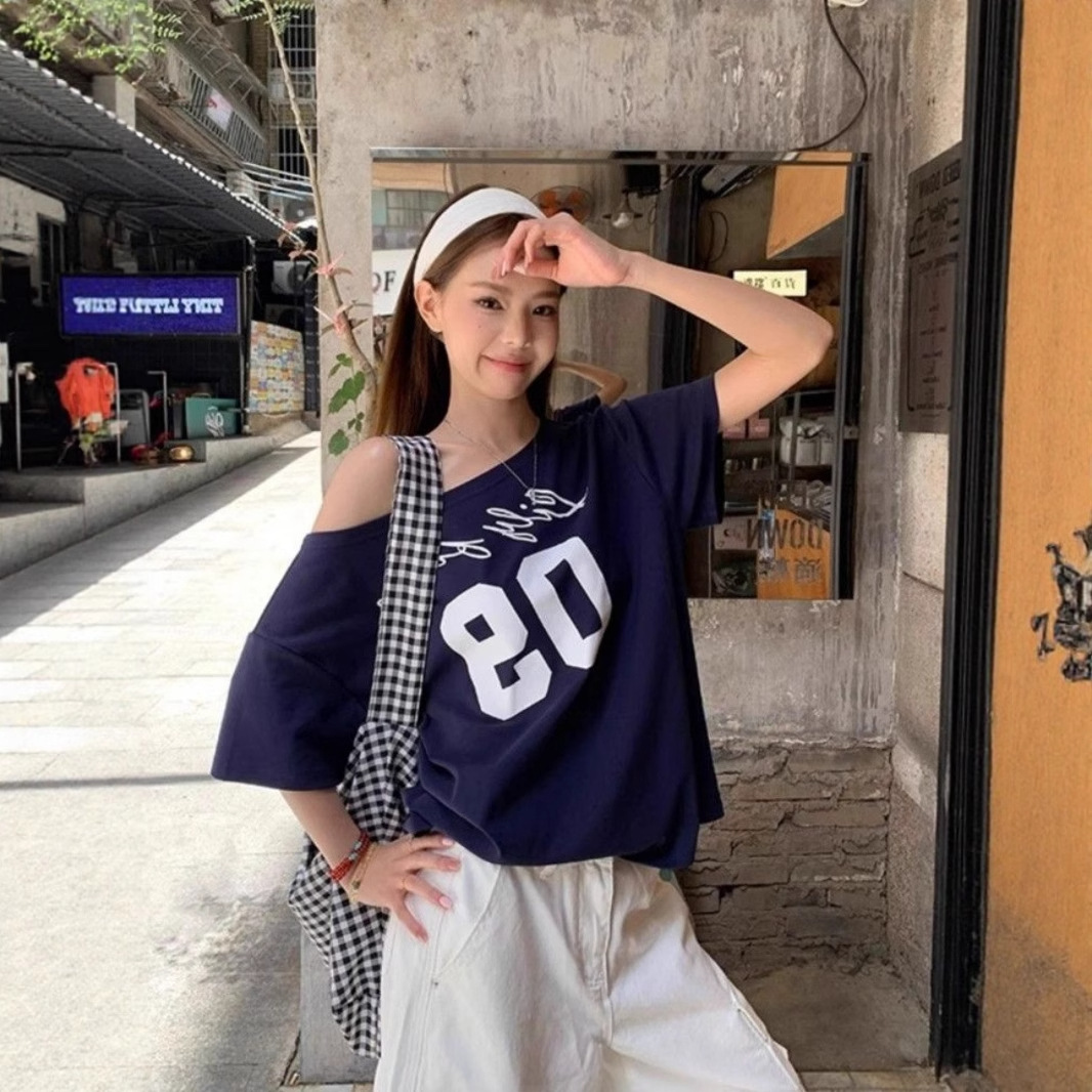Kaus Lengan Pendek Longgar Kasual Bahu Terbuka Gadis Pedas Retro Gaya Amerika Atasan Biru Tua Gaya Desain Niche Gaya Malas Musim Panas Wanita
