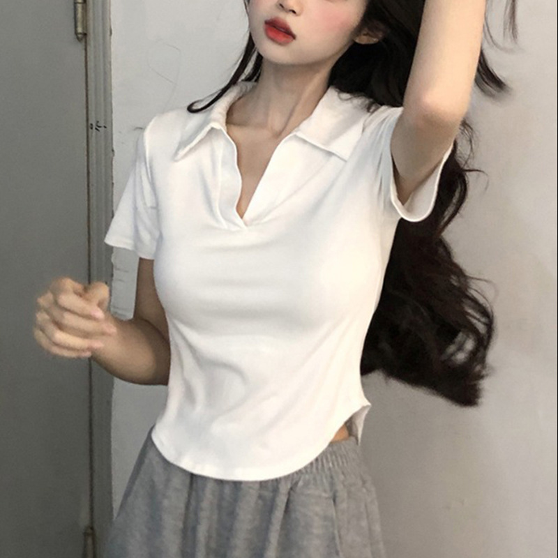 Kaus lengan pendek warna polos potongan musim panas wanita perdagangan luar negeri seksi wanita modis kecil kerah V desain pendek Wanita atasan ramping
