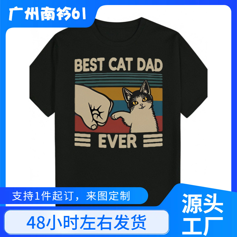 Cross Border Grosir Pria Kasual Hitam T-shirt Polyester, Gambar Ayah Kucing Vintage, Leher Bulat Sedikit Elastis Musim Panas