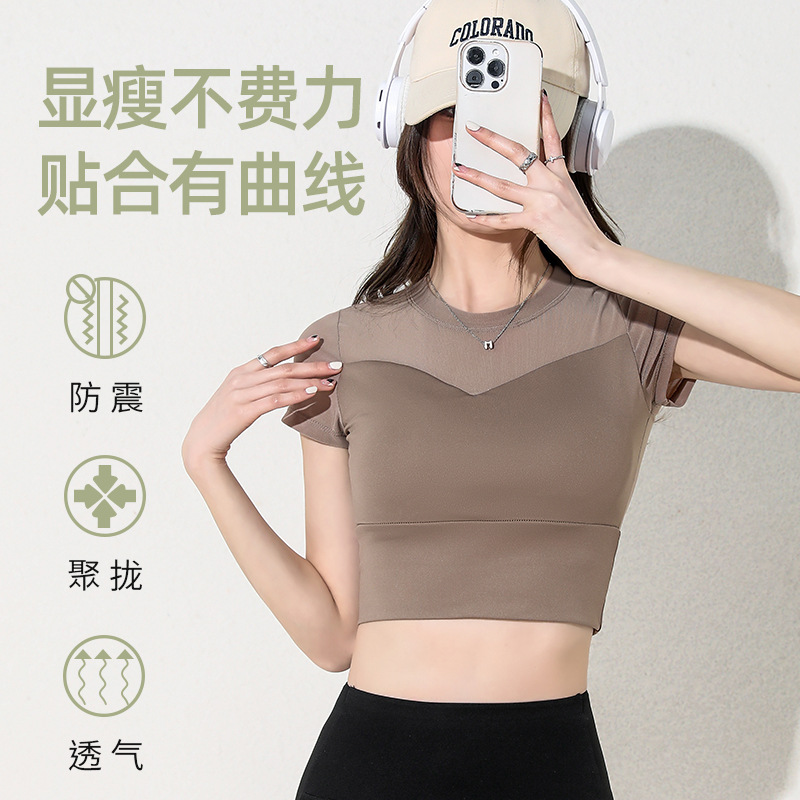 春夏新款网纱镂空露脐瑜伽短袖一体式带胸垫紧身弹力健身运动t恤
