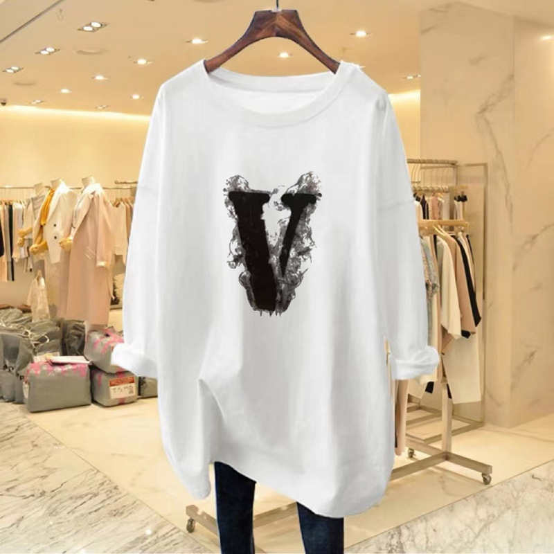 2025 T-shirt Longgar Kasual Kerah V Longgar Lengan Panjang Model Baru Eropa dan Amerika Atasan Pakaian Wanita Ukuran Besar Pasokan Lintas Batas
