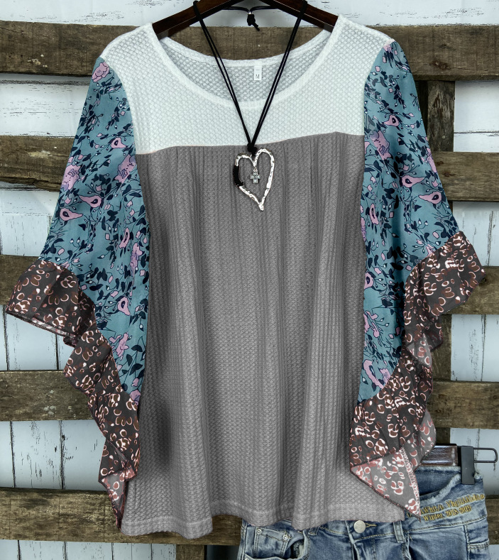 Atasan kaus wish Amazon wanita lengan panjang, atasan kaus ukuran plus, lengan panjang, motif Zou, berlipat, leher V, Amazon wish, baru, musim semi, 2021