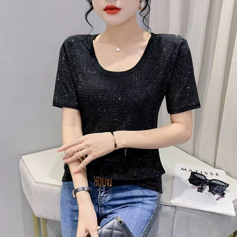 Kaus lengan pendek berlian imitasi, atasan kecil pelangsing gaya Barat baru Musim Panas 2024 untuk wanita