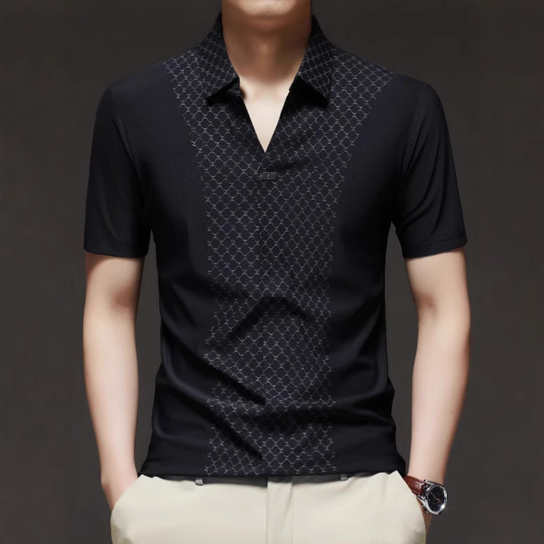Kemeja Pria Sutra Es High-end Cross-Border Lengan Pendek Musim Panas Model Tipis Kerah Gunting Kerah Cetak Kaus Kasual Bisnis Pria