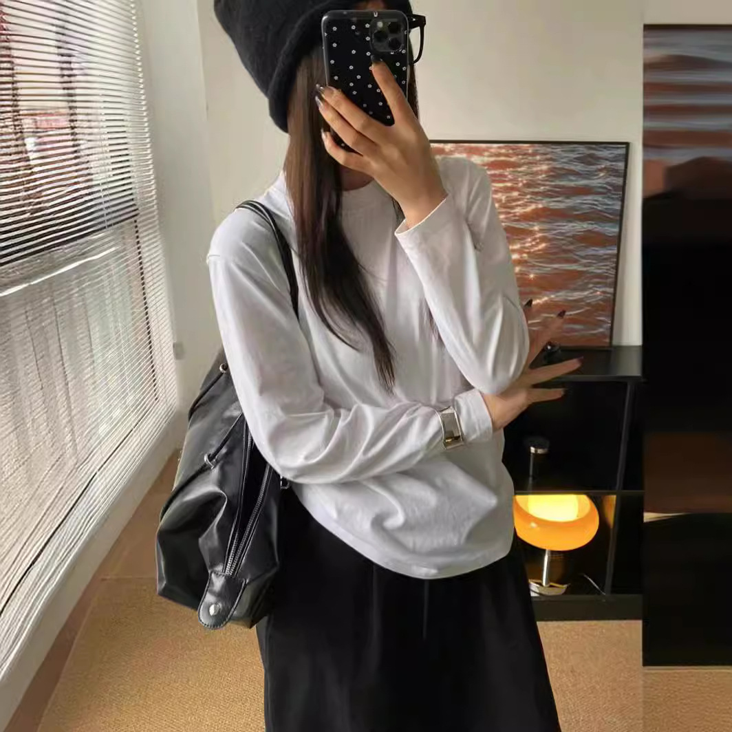 Kaos oblong putih lengan panjang model minimalis dengan kerah bulat untuk wanita, potongan ramping, longgar dan nyaman, terbuat dari katun Xinjiang berkualitas tinggi.
