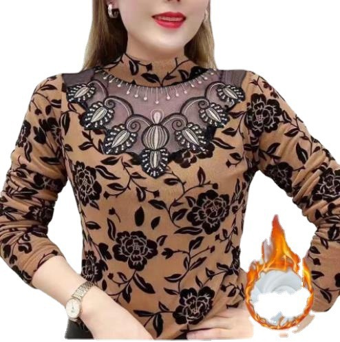 Kemeja Dalaman renda berlapis bulu berongga untuk wanita, atasan jaring Lengan Panjang dalam gaya Barat ukuran besar modis baru Musim Dingin 2022