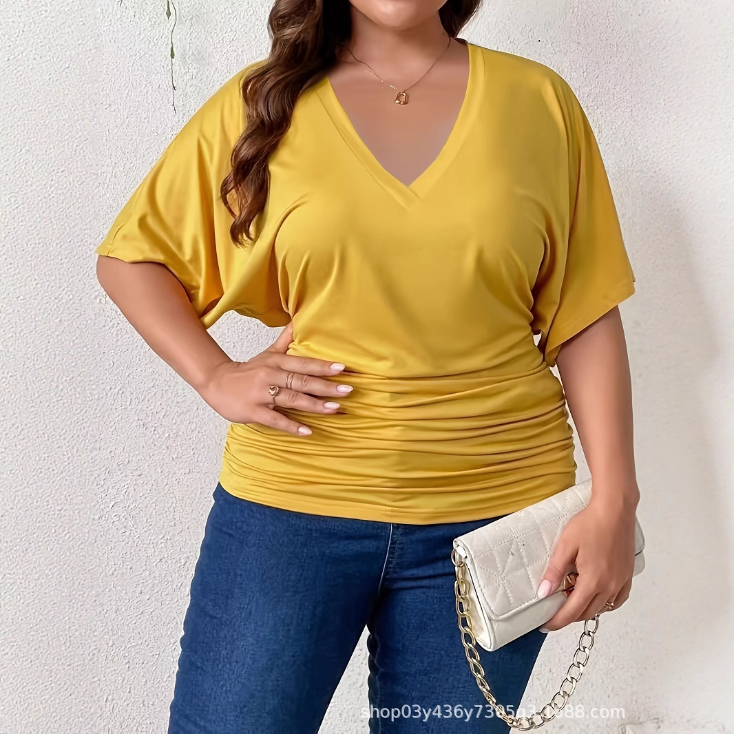 Kaus Baju Atasan Ukuran Besar Lengan Pendek Kasual Kerah V Warna Solid Longgar Pakaian Wanita Eropa dan Amerika Crossborder Amazon Musim Panas Model Baru 2025
