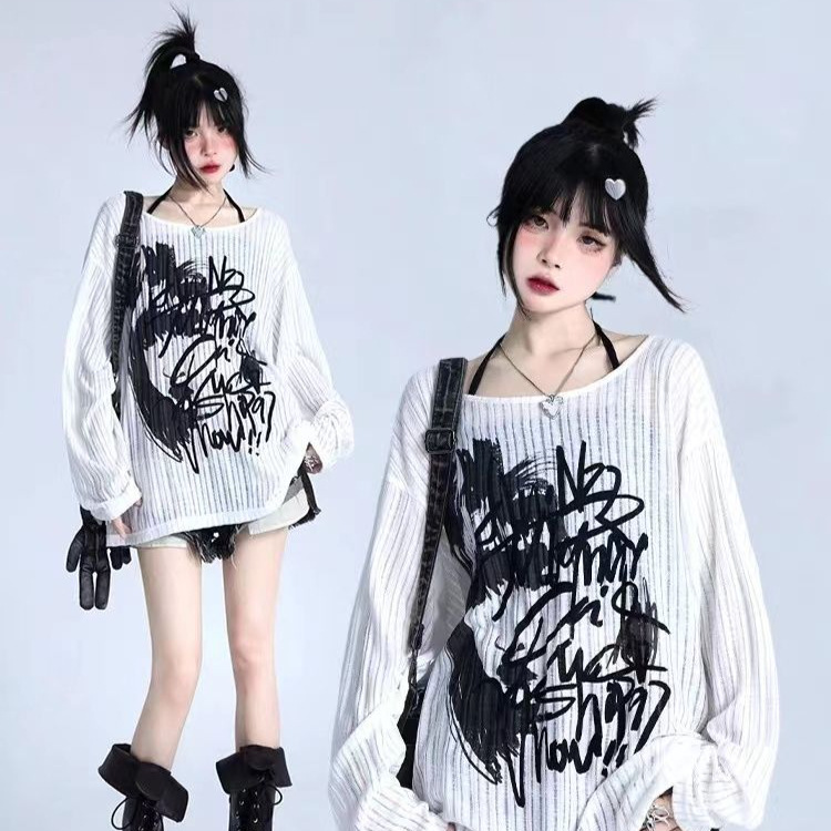 Kaus Pelindung Terik Matahari Musim Panas Dalaman Warna Putih Kaus Lengan Panjang Motif Graffiti Kaus Rajut Terlihat Kurus Longgar Atasan