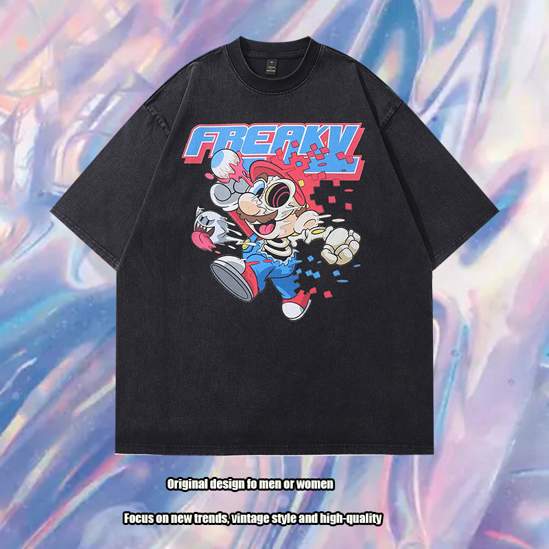 Tkura kaus lengan setengah panjang pria dan wanita, T-shirt pudar kartun merek mode nasional pria dan wanita, atasan lengan setengah retro jalanan Amerika