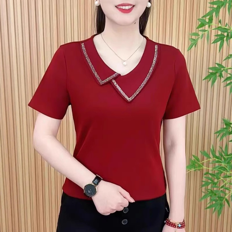 Pakaian Wanita Ukuran Besar Kaus Berlian Panas Musim Panas Atasan Sederhana Ibu Longgar Model Baru T-shirt Mudah Dipadu Padan Kaus Dalaman Wanita Kerah V Menutupi Perut