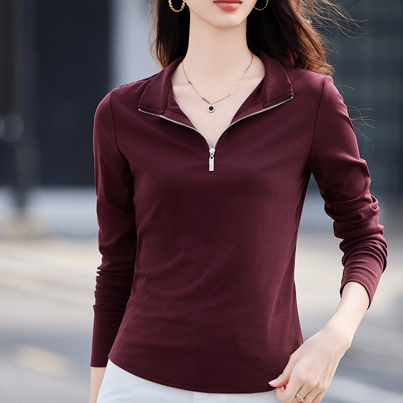 Kaos Wanita Lengan Panjang Ritsleting Kerah Terbalik Kemeja Bottoming Terlihat Langsing Longgar Model Baru Musim Gugur T-shirt Netral Atasan Kasual