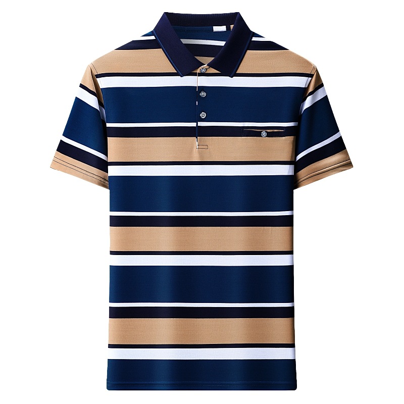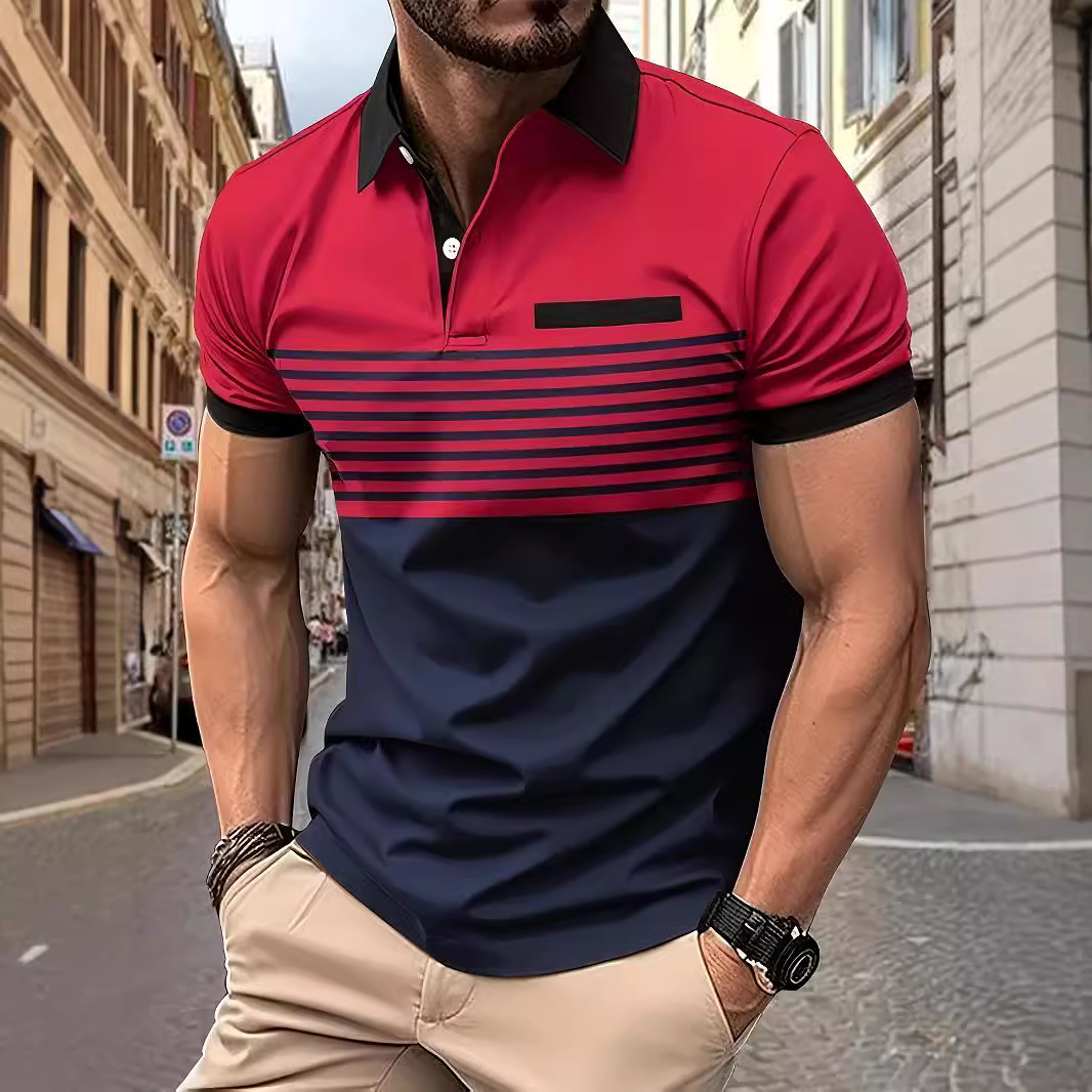 2025新款亚马逊新款3D跨境男士休闲POLO衫胸前口袋V领扣子条纹拼