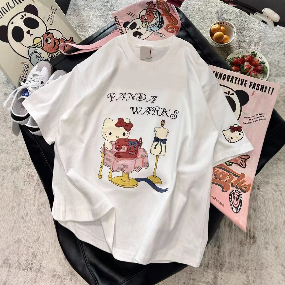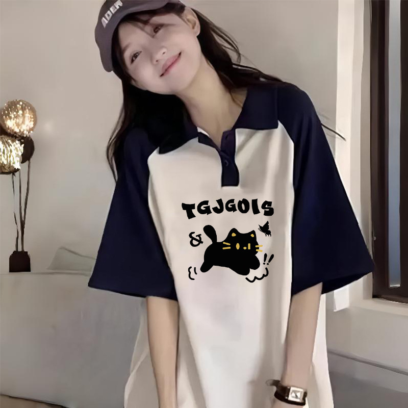 Kaus Lengan Pendek Kerah Bulat Kerah Katun Murni Model Baru Musim Panas Kartun Manis Lucu Seri Jepang Motif Cetak Kucing Kerah Bulat Wanita