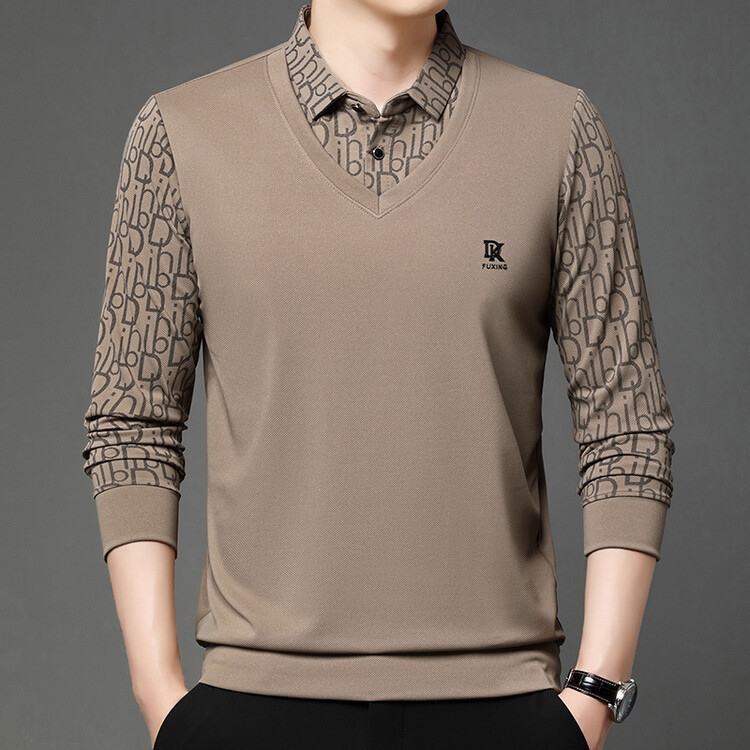 季新款假两件长袖男翻领上衣条纹打底商务POLO衫中年爸爸Polo衫