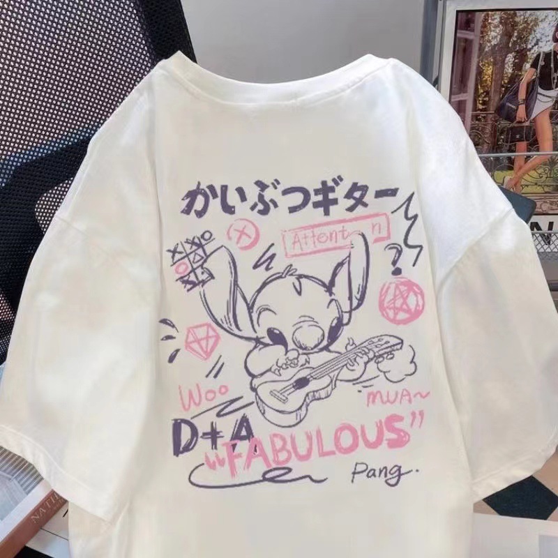 纯棉后包领 美式复古夏季新款卡通绘画史迪仔印花圆领短袖T恤男女