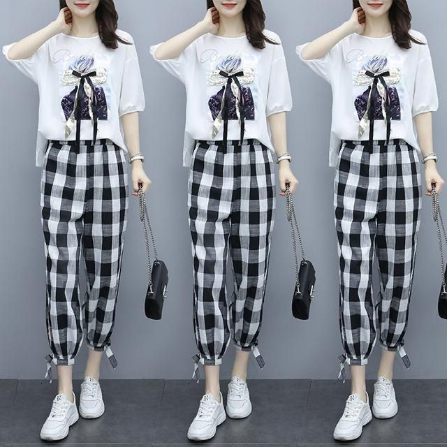 Setelan baru 2024 kaus lengan pendek wanita ukuran besar baru kaus pelangsing anak perempuan chubby gaya Inggris celana kotak-kotak set dua potong