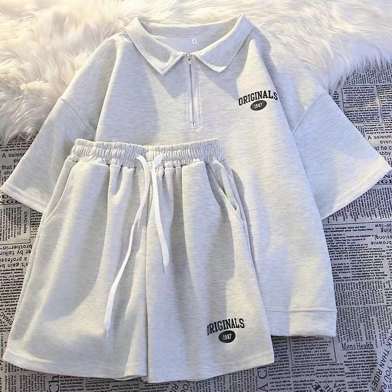 Setelan pakaian olahraga kasual wanita Korea, dua potong baju polo longgar lengan pendek kerah kaki lebar musim panas